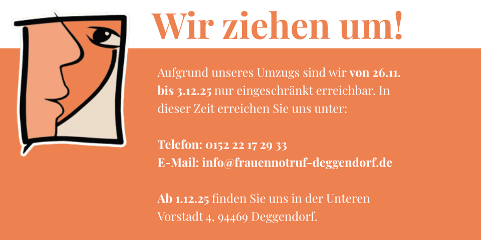 WICHTIG: Von 26.11. bis 3.12.25 sind wir wegen Umzug nur eingeschränkt per Telefon unter der 0152 / 22 17 29 33 und per E-Mail unter info@frauennotruf-deggendorf.de erreichbar.